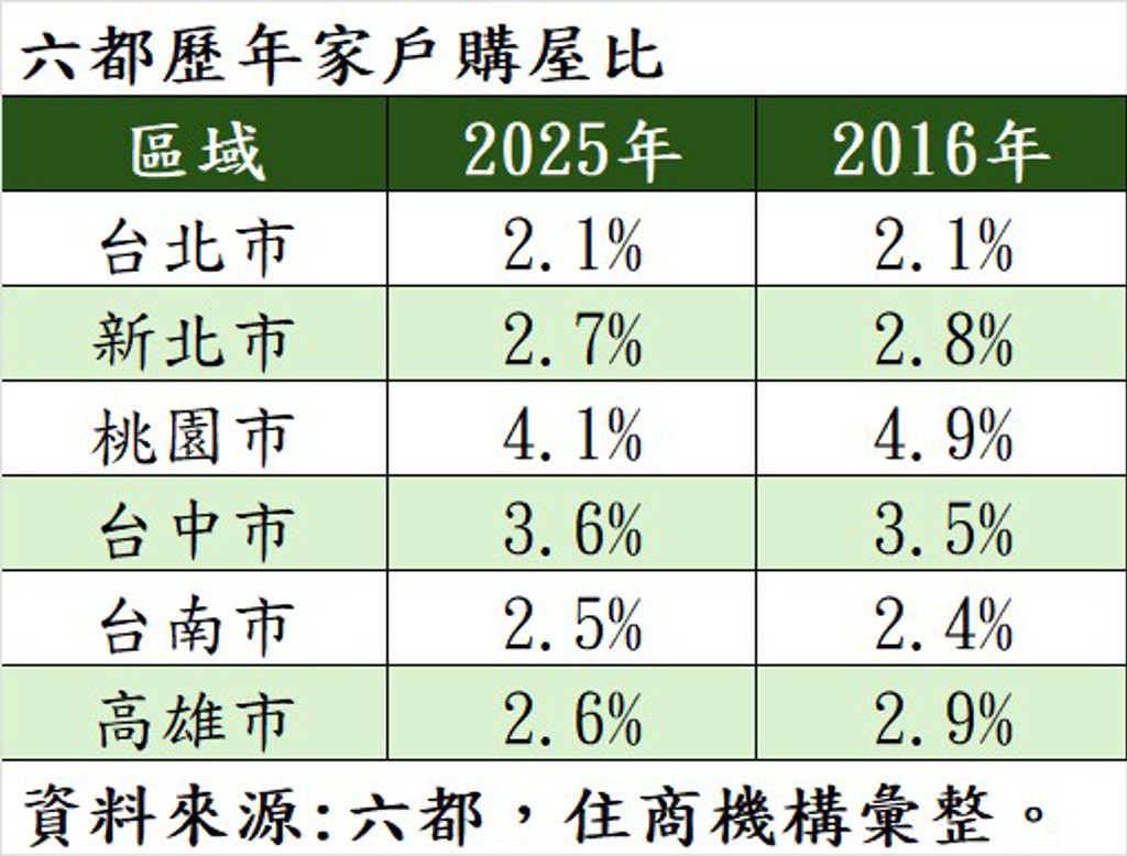 大環境衝擊,2025年房市陷入急凍,住商機構統計六都與內政部資料,六都2025年家戶購屋比全數下滑,其中新北市、桃園市與高雄市更寫下2016年以來新低紀錄。